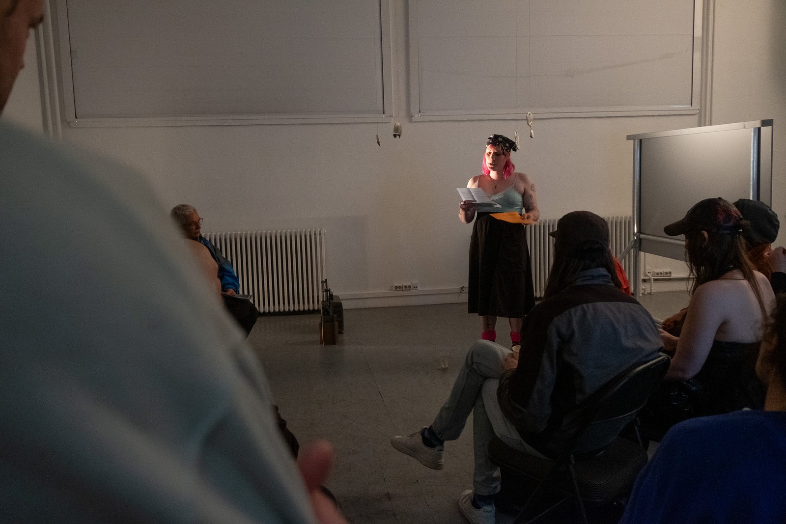 an afternoon of performances at Kunstnernes Hus, Oslo, NO, 2024Biographies: Silje Iversen Kristiansen (born Norway) deals with human experiences and time, from a subjective point of view. She focuses on what’s asking for her attention from day to day, and takes it from there. Her work primarily take shape as drawings, installations, soundworks and performance. Belladonna Paloma (born UK) is an artist, poet and trans witch living on a remote croft in the Shetland Isles. She paints, tattoos, writes poetry, and makes computer games. Her work is into listening to faeries, how divination disturbs linear time, grief rituals, toilet gods and necromancy. Bella makes art as acts of devotion. This devotion has most recently centred on Shetland’s boglands, and wetlands more generally, continuing her interest in the politics and mysticism of what we choose to call ‘waste’. Some places her work has been published and exhibited by: Glasgow International Festival (June 2024), Glasgow Zine Fair (2024), Almanac Journal of Trans Poetics (upcoming), The Overkill Festival, Netherlands, in collaboration with Uma Breakdown (2023), IMT Gallery, London (2023), Collective, Edinburgh, in collaboration with Rabindranath X Bhose and Oren Shoesmith (2023), Vital Capacities (2023), Sluice Magazine (2023), Museum of Contemporary Art, London (2023), TISSUEPAPER Magazine (2023), Gropius Bau, Berlin, in collaboration with Daniella Valz Gen (2023), Gaada, Shetland (2023), Sticky Fingers Publishing (2023), Art Licks (2022), Two Queens, Leicester (2022), Abingdon Studios Project Space, Blackpool (2022), Cariboo Projects, Bristol (2021), and Supernormal Festival, Oxfordshire (2019). Her book-length poem about Bigfoot, There’s always things falling out the sky, was published by Pink Sands Studio Press, 2021. Robert Carter (born UK) is an artist and writer from Manchester living in Oslo. He graduated from the Bergen Art Academy in 2020 with Notes on Dad, a short film which depicted the artist with his sister cleaning their dad’s apartment together. In 2022 he self-published the Dental Advice Bureau, a ‘lock down’ journal made up of creative non-fiction from seven artists. Recent solo exhibitions includeHappy Man(Isotop, Bergen) and Baked Painting(home alonE, Clermont-Ferrand). Photography: Johan Andrén |